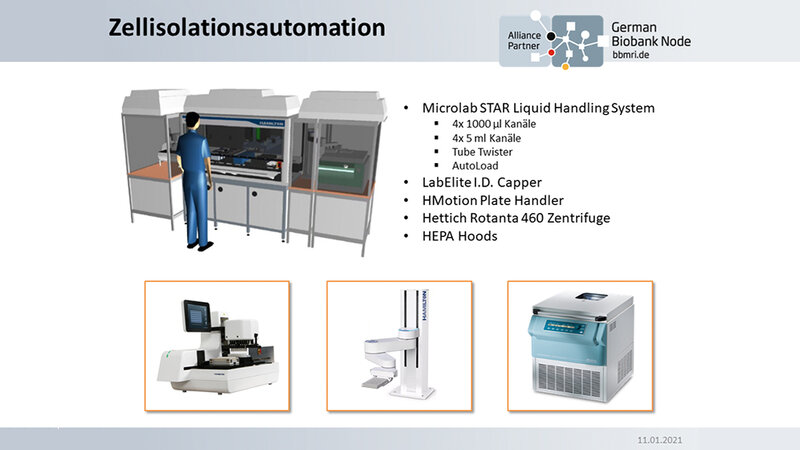 Die Isolation von MNCs stellt eine zentrale Methode zur Beantwortung immunologischer und hämatologischer Fragen in multiplen Bereichen der experimentellen und klinischen biomedizinischen Forschung dar und ist daher relevant für das Biobanking. Traditionell erfolgt die Isolation von MNCs weitestgehend manuell und bringt neben der Heterogenität der Aufarbeitung auch einen hohen Zeit- und Personalaufwand mit sich, was den Durchsatz limitiert. Vor diesem Hintergrund wurde zusammen mit der Firma Hamilton ein komplexes Robotiksystem entwickelt, das den manuellen Isolationsprozess ersetzen soll. Das Validierungskonzept orientiert sich an den Vorgaben der ISO 20387 und umfasst drei Teilprozesse: die Aufarbeitung von Blut, die Aufarbeitung von Knochenmark und die IT-Validierung. Im Folgenden wurden die Daten der Validierung von Blut präsentiert. Verglichen wurde die manuelle Bearbeitung durch die TA parallel zum Robotiksystem. Anschließend wurden die isolierten MNCs untersucht. Das Analysespektrum umfasste dabei eine vollautomatisierte Zellzählung mittels der Sysmex-Technologie und der Multiparameter-Durchflusszytometrie. Am Ende war die absolute Anzahl an MNCs mittels Robotikisolation im Vergleich zur manuellen Aufarbeitung höher und die Aufreinigung standardisierter (= geringere Schwankung zwischen den Messungen). Zusätzlich wurden keine Zellsubgruppen (B-Zellen, dendritische Zellen, T-Zellen et cetera) an- oder abgereichert. Die Aufarbeitungsdauer unterschied sich zwischen beiden Methoden kaum und dauerte für zwölf Proben im Mittel 3,5 Stunden.