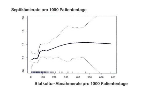 Dabei wird jedoch bisher kein Korrekturfaktor für die Anzahl abgenommener Blutkulturen berücksichtigt. Es ist zu vermuten, dass die Häufigkeit der Abnahme von Blutkulturen direkt mit der Septikämierate korreliert. Jede abgenommene Blutkultur bietet die Chance, eine Septikämie zu entdecken, während jede bei entsprechender Indikation (z.B. Fieber) nicht durchgeführte Blutkultur umgekehrt das Risiko mit sich bringt, dass eine Septikämie unentdeckt bleibt.