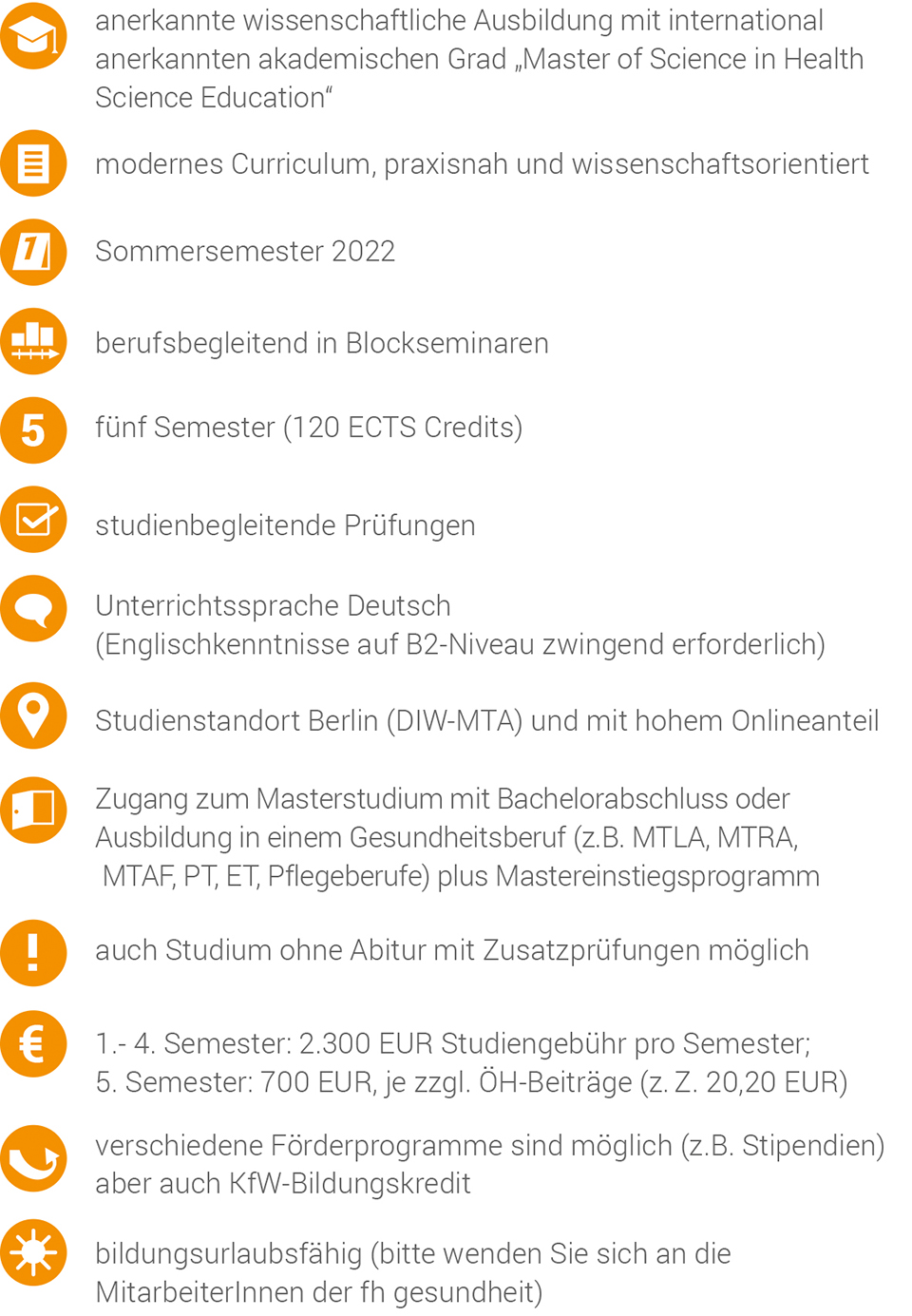 Die fh gesundheit in Innsbruck (Österreich) und das DIW-MTA in Berlin bieten in Kooperation für Lehrende an Schulen des Gesundheitswesens (zum Beispiel MTA-Schulen, Pflegeschulen, PTA-Schulen) sowie für diejenigen, die es werden wollen, die Möglichkeit, berufsbegleitend einen fünfsemestrigen Masterlehrgang in „Pädagogik in Gesundheitsberufen“ mit einem international anerkannten Abschluss „Master of Science in Health Science Education (MSc)“ mit 120 ECTS Credits zu absolvieren. Studienort ist Berlin verbunden mit einer hohen Anzahl von Online-Veranstaltungen.