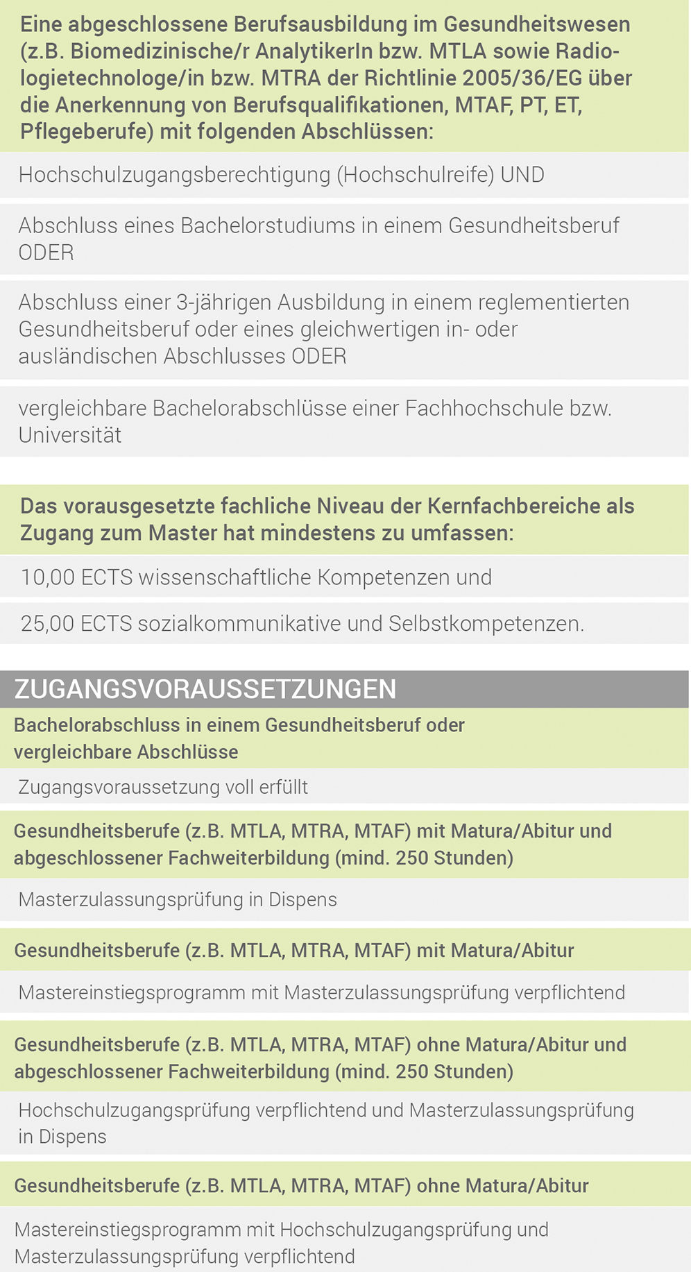 Um mit dem Masterlehrgang „Pädagogik in Gesundheitsberufen“ beginnen zu können, sind folgende Voraussetzungen zu erfüllen: