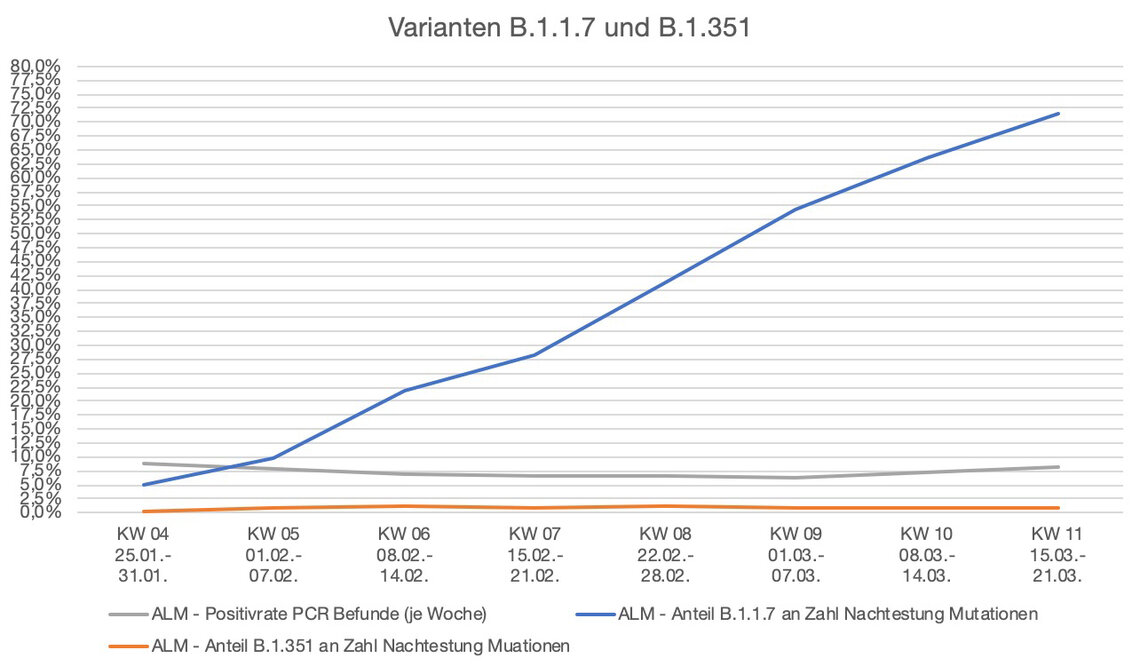 Insgesamt fielen in der KW 11 von den durchgeführten 1.196.364 (Vorwoche: 1.090.422) SARS-CoV-2-PCR-Tests 98.762 positiv aus (Vorwoche: 77.646). Die Auswertung der Daten der nun 175 Labore aus dem ambulanten und stationären Bereich weist eine erneut deutlich gestiegene Positivrate von 8,3 Prozent (Vorwoche 7,2 Prozent) aus. Gleichzeitig habe sich die Variante B.1.1.7 weiter ausgebreitet. „Neben dem forcierten Impfen und der konsequenten Umsetzung der Nationalen Teststrategie mit breiter und niedrigschwelliger Testung nach den RKI-Kriterien bleiben die bekannten allgemeinen Maßnahmen mit Kontaktreduktion, Abstand halten, Maske tragen, Lüften in Innenräumen und der Nutzung der Corona-Warn-App weiterhin das wirksame Mittel gegen die Ausbreitung von SARS-CoV-2. Jede und jeder von uns kann hier einen Beitrag leisten“, sagte Dr. Michael Müller, 1. Vorsitzender des ALM e.V., bei einer Pressekonferenz. Die Auslastung der Labore erreichte 61 Prozent. Damit sei die Auslastung in einem komfortablen Bereich und es gebe einen guten Puffer in den anstrengenden Wochen, um das Testgeschehen zu intensivieren, so Müller. Dennoch gibt der Vorsitzende zu bedenken: „Wir können Corona nicht wegtesten.“