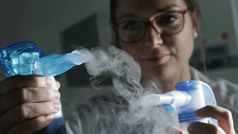 Die Wirkstoffteilchen müssen zunächst eine bestimmte Größe haben, um in die tieferen Atemwege zu gelangen und nicht vorher irgendwo abzuprallen. Schließlich müssen sie sowohl die dicke Schleimschicht auf den Atemwegen als auch die unteren Schichten des Bakterien-Biofilmes durchdringen.