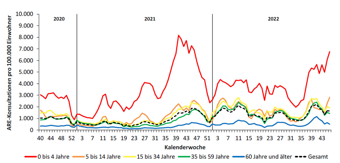 Laut AG Influenza ist die Aktivität der akuten Atemwegserkrankungen (ARE-Raten) in der Bevölkerung (GrippeWeb) in der 46. KW 2022 im Vergleich zur Vorwoche insgesamt deutlich gestiegen.