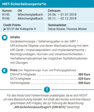 Die Weiterbildung zum „MRT-Sicherheitsexperten“ wird vom DIW-MTA zweimal pro Jahr – mit freundlicher Unterstützung von Prof. Dr. med. Dirk Blondin und OA Thomas Winter – im Elisabeth Krankenhaus Rheydt in Mönchengladbach angeboten und umfasst 30 Seminarstunden sowie eine Prüfungsleistung in Form einer Klausur.
