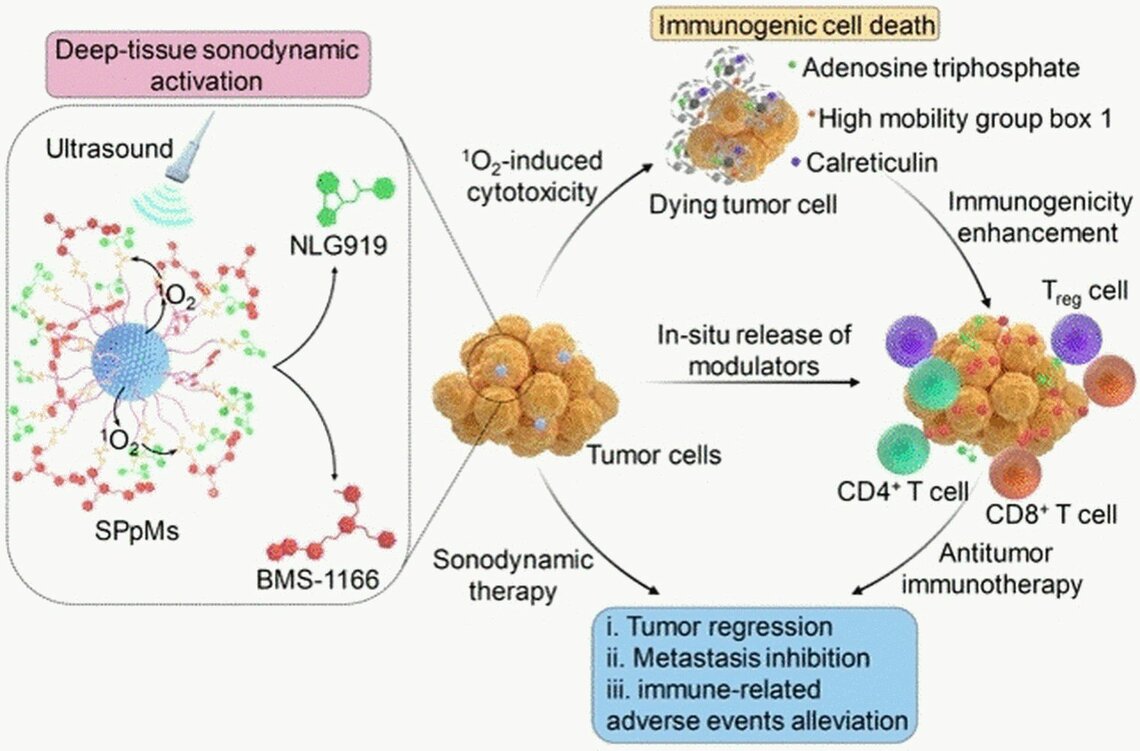 Pu und sein Team stellten nun aus einem ultraschallresponsiven Halbleiterpolymer Nanoteilchen her. Angeregt durch den Ultraschall, übertrugen diese Nanoteilchen ihre Energie auf molekularen Sauerstoff, der dadurch in Singulett-Sauerstoff, einer Art von reaktivem Sauerstoff, überging. Die Bereitstellung des Singulett-Sauerstoffs in der Zelle leitete dann den Zelltod durch Eigen-Immunreaktion ein. Das war möglich, weil zusätzlich zwei spezielle immunmodulierende Wirkstoffe an das Polymer gebunden mit in die Zelle eingeschleust wurden. Aktiviert durch die Ultraschallbehandlung löste der Singulett-Sauerstoff die Bindung und setzte die Wirkstoffe frei.