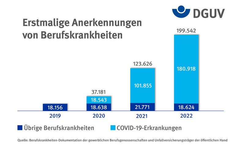 Hauptursächlich für den Anstieg bei den Anerkennungen von Berufskrankheiten ist die Coronapandemie. Rund 180.000 Anerkennungen entfielen im Jahr 2022 auf COVID-19. © Deutsche Gesetzliche Unfallversicherung (DGUV)