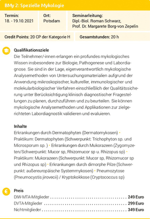 Auch die Durchführung der Kurse „Repetitorium Mykologie“ und „Spezielle Mykologie“, die im Oktober 2020 in Potsdam stattfanden, zeigten die Unwegsamkeiten der Pandemie auf, die schlussendlich jedoch erfolgreich beseitigt werden konnten. Da der Dozent des Seminars, Roman Schwarz, aus Köln stammt, galt für ihn ein Beherbergungsverbot in Potsdam, sodass verschiedene Möglichkeiten im Vorfeld diskutiert wurden, wie das Seminar doch noch stattfinden könnte. Schlussendlich wurde das Beherbergungsverbot kurz vor Seminarbeginn von Gerichten gekippt, sodass Roman Schwarz regulär nach Brandenburg einreisen und unterrichten durfte. Nicht nur Roman Schwarz, sondern auch Frau Reuter sei für ihr Engagement gedankt, dass das Seminar so erfolgreich stattfinden konnte. Denn auch vor Ort musste ein ausgeklügeltes Hygienekonzept zur Durchführung des Seminars umgesetzt werden. So waren nur drei Teilnehmende vor Ort, die restlichen Teilnehmenden waren online zugeschaltet. Leider mussten demzufolge einige praktische Teile wie das selbstständige Mikroskopieren wegfallen, aber die online zugeschalteten Teilnehmenden konnten digital ihren Kollegen/-innen über die Schulter schauen und Fragen stellen. Für das kommende Jahr 2021 sind die Seminare bereits wieder terminiert, in der Hoffnung, dass sie regulär in Potsdam stattfinden können.