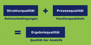Die Strukturqualität ergibt sich aus den vorherrschenden Rahmenbedingungen innerhalb der Organisation. Ihr Erfüllungsgrad wird daran gemessen, inwieweit die strukturellen Merkmale geeignet sind, um die mit der Unternehmenspolitik verknüpften Ziele zu erreichen. Zu den Merkmalen gehören bauliche, technische und personelle Rahmenbedingungen – zum Beispiel Gebäude, Lage sowie räumliche und technische Ausstattung der Organisationseinheit. Weitere wesentliche Merkmale sind die Qualifikation der Führungskräfte sowie der Mitarbeiterinnen und Mitarbeiter, die Ausprägung der Arbeitsplatzhygiene (Arbeitssicherheit, Brandschutz und Hygiene), die verfügbaren finanziellen Ressourcen sowie das Vorhandensein und die Einhaltung von Standards. Die externen Einflussfaktoren auf die Strukturqualität werden durch das politische und ökonomische Umfeld dargestellt. Dessen Ausprägung kann mithilfe einer PEST-Analyse (zu Deutsch: politisch, ökonomisch, sozio-kulturell, technologisch) bestimmt werden. Die intern auf das Unternehmensgeschehen wirkenden Faktoren werden mittels einer SWOT-Analyse (zu Deutsch: Stärken, Schwächen, Chancen, Risiken) definiert. Denn letztlich beeinflusst die Strukturqualität maßgeblich das erreichbare Niveau der nachfolgend beschriebenen Prozess- und Ergebnisqualität.