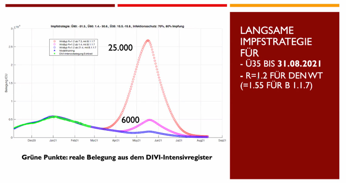 Das Worst Case-Szenario im Modell liegt denn auch bei bis zu 25.000 Patienten auf der Intensivstation. Dies wäre die Prognose bei einer Lockerung bereits im März und einer langsamen Impfstrategie der Ü35-Gruppe bis 31.8.21, bei einem angenommenen R-Wert für den Wildtyp von 1,2 und 1,55 für B.1.1.7.