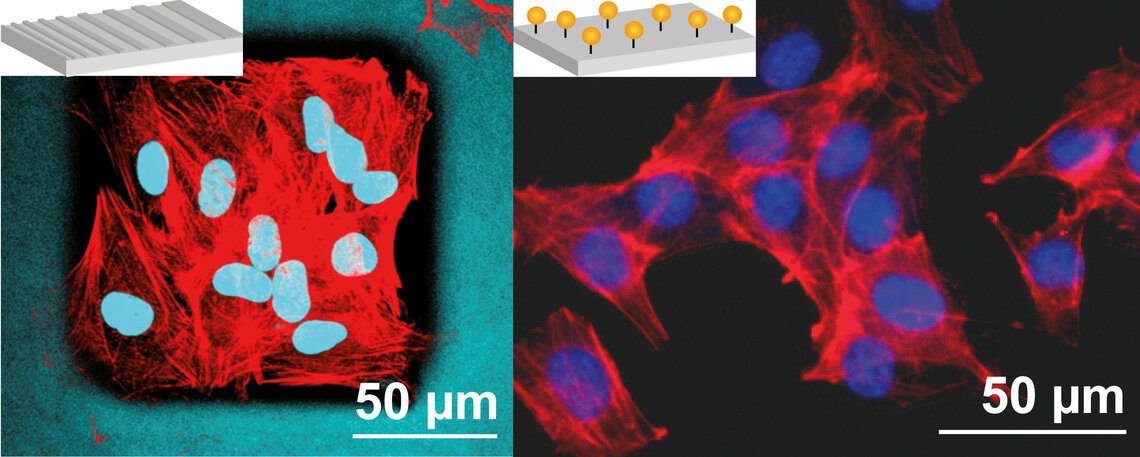 Die zweite Studie präsentiert einen anderen Weg zur Optimierung von Spinnenseide-Materialien. Beschichtungen, die aus einem direkt von der Seide der Gartenkreuzspinne abgeleiteten Seidenprotein gefertigt sind, zeigen von sich aus – ohne biochemische Modifikation – kein zelladhäsives Verhalten. Das Forschungsteam um Prof. Dr. Thomas Scheibel hat jetzt mit einem lithografischen Verfahren die Oberfläche dieser Beschichtungen so strukturiert, dass dadurch die Anlagerung und das Wachstum von Zellen eines bestimmten Typs gezielt stimuliert werden. Die Reaktionen unterschiedlicher Zellen auf die Form und Größe der in die Oberfläche eingeprägten geometrischen Strukturen hängen stark vom jeweiligen Zelltyp ab. Unter anderem von der Größe der jeweiligen Zellen. Dies hatten umfangreiche Tests belegt. „Auf der Basis unserer Forschungsergebnisse wird es möglich sein, Beschichtungen aus Seidenproteinen – oder auch aus anderen biokompatiblen Materialien – lithografisch so zu optimieren, dass sie zellspezifisch die natürliche Regeneration komplexer Gewebestrukturen anregen und vorantreiben“, sagt Scheibel.
