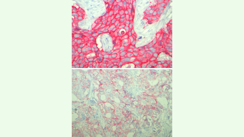 „48 Prozent dieser Gewebeproben zeigen eine schwach-positive Konzentration von HER2“, berichtet Denkert. „Wie wir herausfanden, lässt sich Tumorgewebe mit schwacher Positivität für das HER2-Protein als eigener Brustkrebs-Subtyp charakterisieren, der sich von Tumoren unterscheidet, die gar kein HER2-Protein aufweisen.“ Das wirkt sich insbesondere auf das Überleben der Betroffenen aus: „Wenn im Tumor das HER2-Protein in geringer Konzentration vorliegt, ist die Überlebenswahrscheinlichkeit der Betroffenen größer, als wenn das Gewebe gar kein HER2 enthält“, legt Loibl dar.