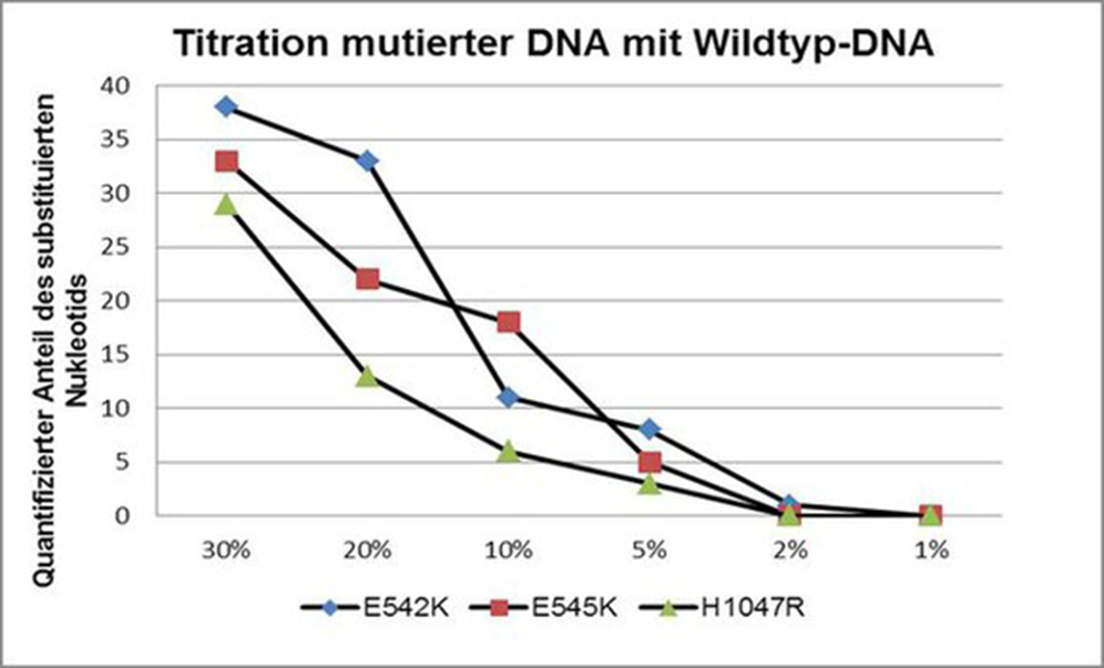 Es konnte festgestellt werden, dass die drei untersuchten Mutationen p.E542K, p.E545K und p.H1047R bis zu einem Mischungsverhältnis von 5% mutierter zu 95% Wildtyp-DNA eindeutig detektierbar waren. Die minimal einzusetzende DNA-Menge lag bei 0,1 ng (p.E542K und p.E545K) bzw. 1ng (p.H1047R). In Abbildung 5 ist die Titration von mutierter DNA mit Wildtyp-DNA grafisch dargestellt. Die X-Achse zeigt den absteigenden prozentualen Anteil mutierter DNA in der hergestellten Verdünnung. Auf der Y-Achse ist die softwarebasierte Auswertung der Signalstärken dargestellt, mit der die Mutation detektiert wurde.