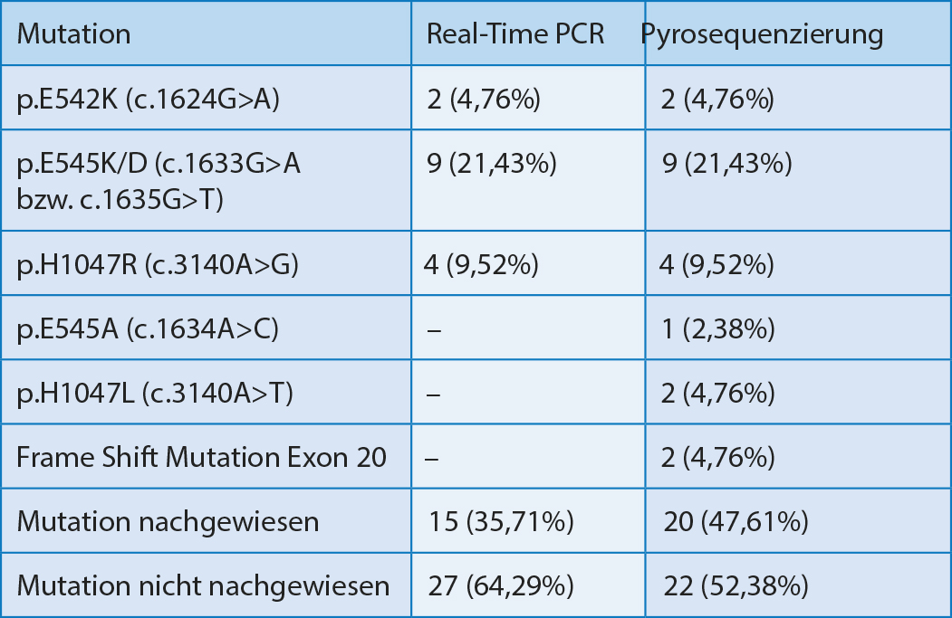 Tabelle 4: Anzahl der nachgewiesenen Mutationen. Vergleich der Pyrosequenzierung mit dem Real-Time PI3K Mutation Test Kit (Qiagen)