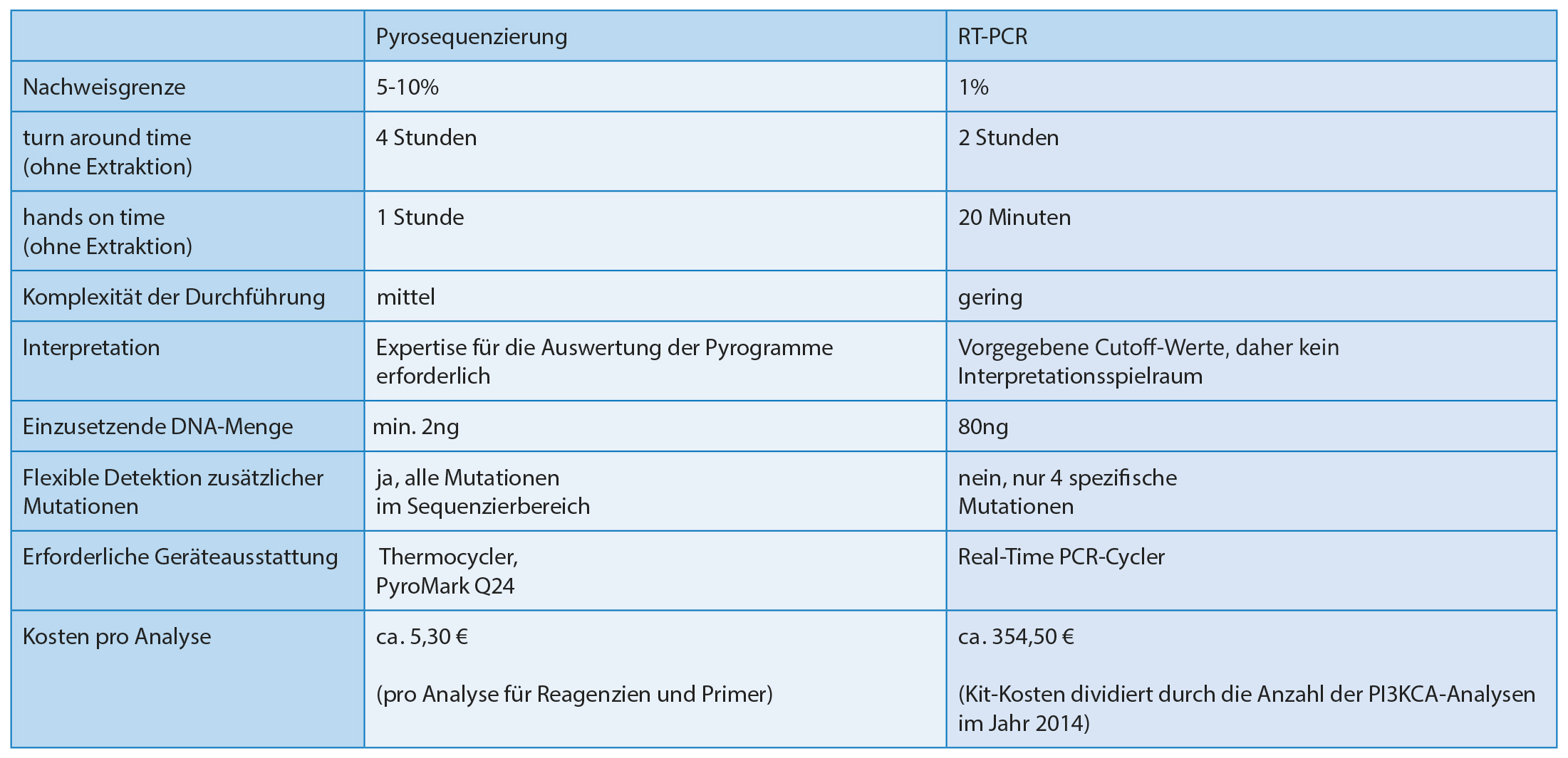 Die Pyrosequenzierung hat sich als robuste und spezifische Methode zur Analyse der klinisch relevanten Mutationen des PI3KCA-Gens erwiesen. Vorteile der Pyrosequenzierung sind der geringere Bedarf an genomischer DNA und die geringeren Kosten pro Analyse. Mit der Pyrosequenzierung werden auch Mutationen erfasst, die mit der RT-PCR aufgrund des Testdesigns nicht detektiert werden. Bei sehr geringen Tumorzellzahlen kann aufgrund der höheren Sensitivität auf die RT-PCR zurückgegriffen werden. Beide Methoden sind jedoch wesentlich sensitiver als die Sanger-Sequenzierung, die im Bereich der Validierung somatischen Mutationen bei Krebserkrankungen allgemein als Goldstandard anerkannt ist. Um der Forderung nach immer mehr Informationen aus immer weniger Untersuchungsmaterial nachzukommen, werden in Zukunft die klassischen Untersuchungsmethoden von sensitiveren Hochdurchsatz-Techniken wie der „Massiven parallelen Sequenzierung“ bzw. dem Next Generation Sequencing (NGS) abgelöst. Eine vielversprechende, nichtinvasive Methode zum Therapiemonitoring und zur Überwachung der Tumorprogression ist z.B. die Analyse von zirkulierenden Tumorzellen (circulating tumor cells, CTCs) und zellfreier zirkulierende Tumor-DNA (cellfree circulating tumor DNA, ctDNA) in Plasma oder Serum. Im Bereich der prädiktiven und prognostischen Molekularpathologie muss die klinische Relevanz dieser Analysen in weiteren umfangreichen Studien validiert werden.