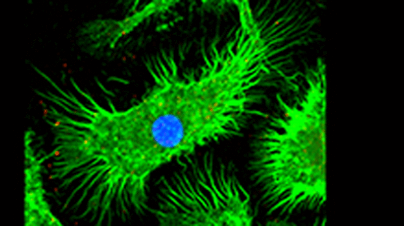 Aktivierte Makrophagen in der Immunfluoreszenz-Mikroskopie, die thrombo-inflammatorische Mikropartikel generieren (grün: Cytoskelett der Zelle (F-Actin), blau: Zellkern, rot: Tissue Factor). The Scripps Research Institute