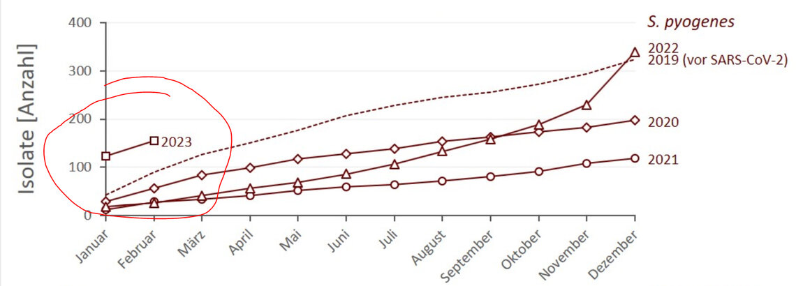 Schon Ende 2022 war es in Deutschland laut RKI zu einer saisonal frühen und starken Zunahme der akuten und schweren Atemwegsinfektionen (ARE und SARI) gekommen. Medizinisches Fachpersonal und Gesundheitsbehörden berichteten zu jener Zeit in Verbindung mit einer hohen Inzidenz viraler Atemwegsinfektionen über ungewöhnlich viele und schwere invasive bakterielle Infektionen, insbesondere durch Gruppe-A-Streptokokken und Pneumokokken.
