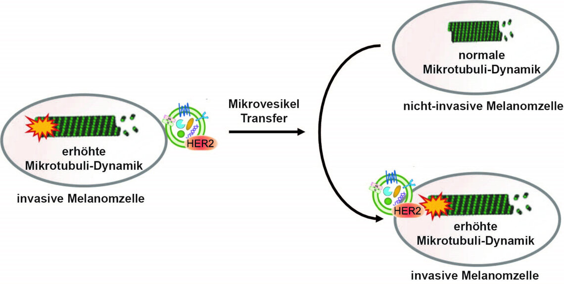 Die Forscherinnen und Forscher in Göttingen nutzten neueste Mikroskopie-Techniken zur Messung der Mikrotubuli-Dynamik in lebenden menschlichen Haut- und Darmkrebszellen. Dabei fanden sie heraus, dass Krebszellen mit fehlerhafter Mikrotubuli-Dynamik diesen Defekt auch auf andere Zellen in ihrer Umgebung übertragen können. Dies erfolgt mittels Austauschs von kleinen Zellabschnürungen, den sogenannten Mikrovesikeln. Besonders interessant war der Befund, dass die Mikrovesikel von invasiven Hautkrebszellen das krebsfördernde Protein HER2 enthielten und genau dieses für die defekten Mikrotubuli verantwortlich zu sein scheint. Obwohl HER2 ein bereits gut untersuchtes Krebsgen ist, war diese neue Funktion bisher unbekannt. In weiteren Untersuchungen konnten Pudelko, Bastians und Kollegen dann experimentell zeigen, dass eine Hemmung von HER2 oder die Unterdrückung der Mikrotubuli-Dynamik zu einer verringerten Zellinvasion führt.