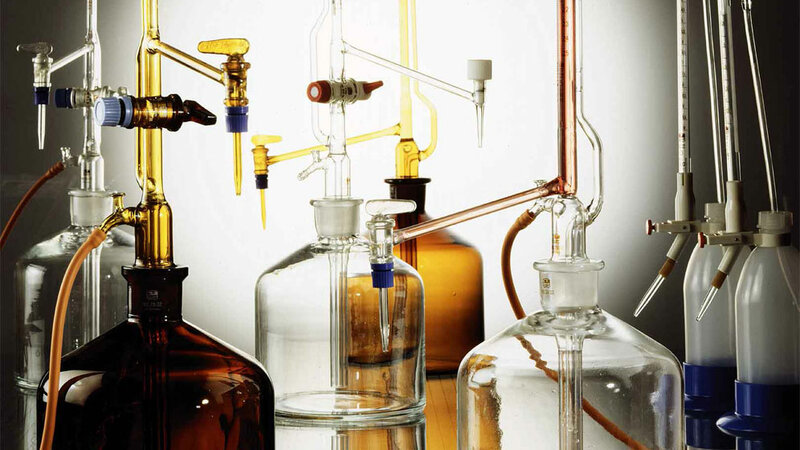 Eine Vielzahl von Flaschen aus Klarglas und Braunglas mit Schraubverschluss oder Stopfen, Kolben und Reagenzgläser mit oder ohne Stopfen (auch graduiert), Flaschen aus Polyethylen sowie Abtropf- und Kristallierschalen runden das Sortiment ab. (HECHT, red)