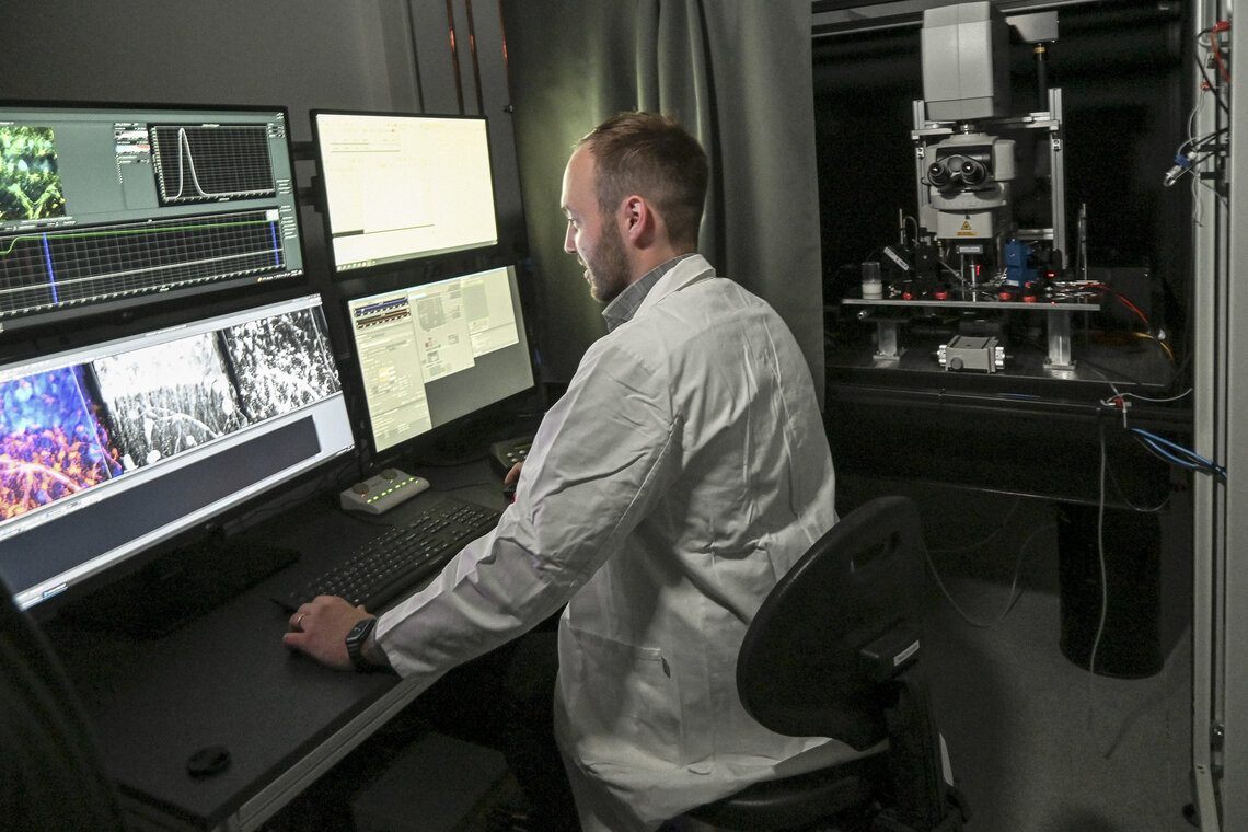 Ein wichtiges Werkzeug der Düsseldorfer Arbeitsgruppe ist die sogenannte Multiphotonen-Laserscanning-Mikroskopie. Bei dem nun neu beschafften Mikroskop handelt es sich um ein System mit einer Erweiterung für sehr schnelle Fluoreszenzlebenszeitmessungen (FLIM) und einer Optogenese-Einheit. Es erlaubt, Natriumveränderungen in kleinsten zellulären Kompartimenten im intakten Gehirngewebe quantitativ zu erfassen und lässt auch genaue Rückschlüsse auf die Verteilung verschiedener anderer Ionen zu.