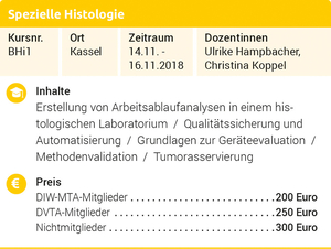Im Vordergrund einer individualisierten Behandlung als vielversprechende Alternative zu herkömmlichen Verfahren steht jedoch die Entwicklung von Modellen, die dazu geeignet sind, komplexe multizelluläre Strukturen von Tumoren abzubilden. Das erfordert das Verstehen der inhaltlichen Komplexität und ein Miteinander der am Entwicklungs- und Arbeitsprozess beteiligten Professionen auf fachlich hohem Niveau. Das DIW-MTA bietet in seinem aktuellen Jahresprogramm wieder Fachqualifikationen im Fach Histologie an, die auch als Einzelseminare belegt werden können. Nach erfolgreichem Abschluss verfügen die Teilnehmer/-innen, angeleitet durch hochkompetente Fachpraktikerinnen, über ein umfangreiches Wissen zu den verschiedenen Gewebearten des menschlichen Körpers, deren wichtigsten pathologischen Veränderungen sowie vertiefter Kenntnisse der Gewebeverarbeitung. Histochemische, immun- und enzymhistochemische Analysemethoden und Applikationen können anschließend im Arbeitsalltag eigenverantwortlich geplant, durchgeführt, beurteilt sowie validiert und evaluiert werden. Eine Erweiterung fachlicher Kompetenzen, deren Verstehen vielleicht sogar einer Hinwendung zu neuen Arbeitsfeldern zuträglich sein könnte, um den vormalig als „Orchideenfach“ geltenden Arbeitsbereich „Histologie/Histopathologie“ mit neuem, spannenden Leben zu füllen. Weitere Informationen unter www.diw-mta.de.