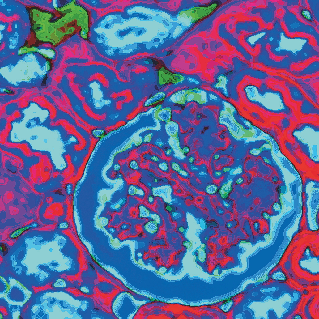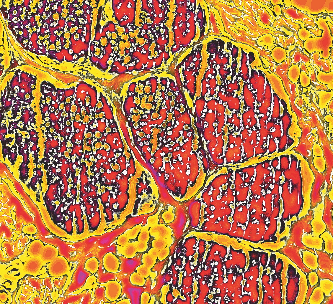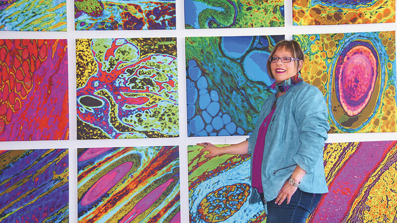 Anne U. Kerber gewährt mit der von ihr erschaffenen eigenen Kunstform „HistoPopArt“ tiefe Einblicke in das Innere des Menschen. Unheimlich bunt und herrlich abstrakt – so wirken die Bilder beim ersten Hinsehen. Doch was zunächst wie beliebig angeordnete Farben, Formen und Muster aussieht, offenbart in Wirklichkeit einen tiefen Blick in das Gewebe des Menschen. Für ihre Bilder stellt Kerber fünf Mikrometer dünne Schnittpräparate von gesundem menschlichen Gewebe her und färbt diese ein. Unter dem Mikroskop werden die Präparate anschließend betrachtet, wertvolle Ausschnitte ausgewählt, fotografiert und danach künstlerisch nachbearbeitet. Die einzelnen Strukturen der Gewebe bleiben dabei aber immer noch deutlich zu erkennen.