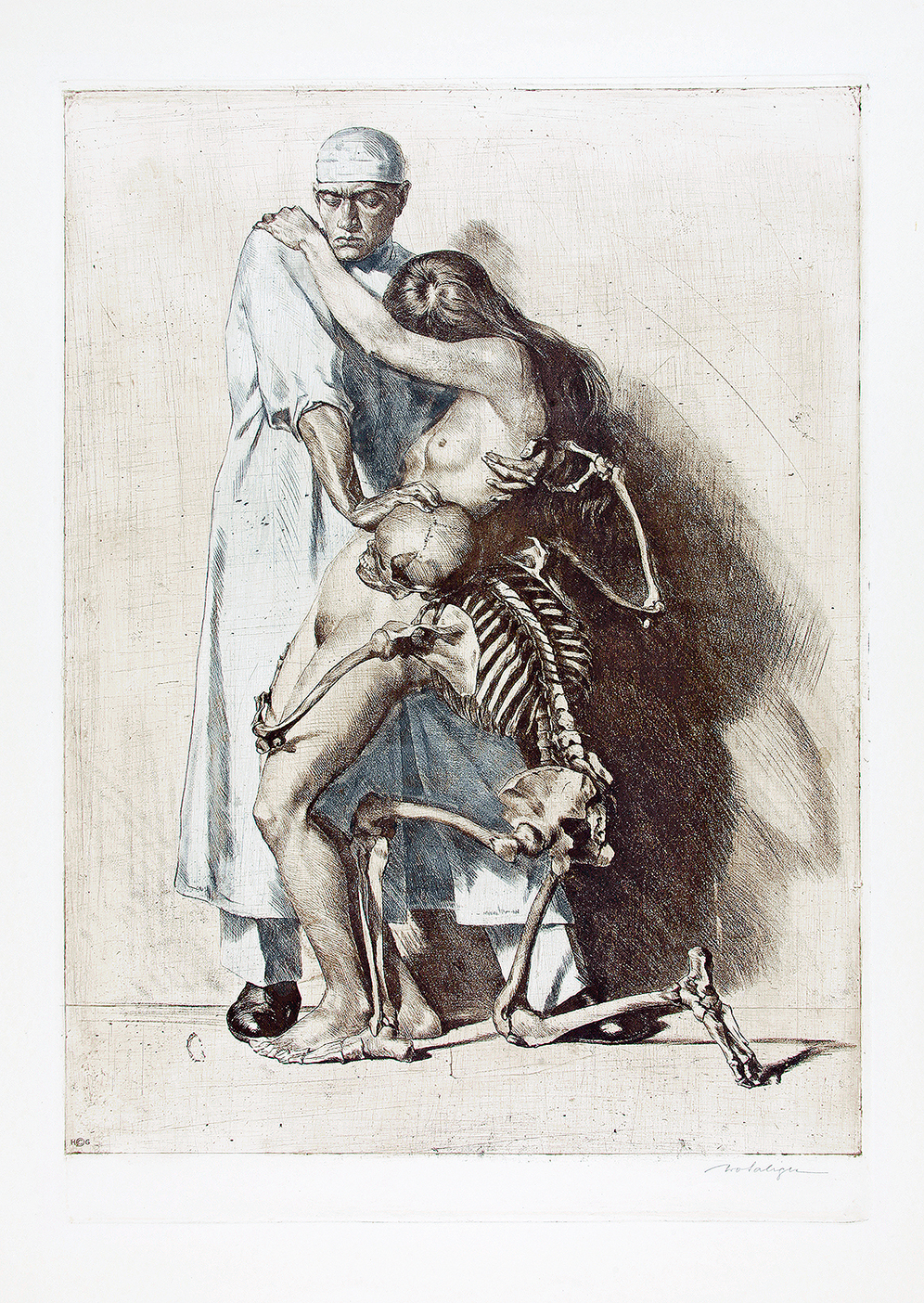 Abb. 6: Ivo Saliger: Chirurg und Tod im Kampf um eine Frau, um 1921 Radierung in Farbe 73,5 x 53,7 cm, Grafiksammlung _Mensch und Tod_ Inv. Nr. E 0552, Heinrich-Heine-Universität Düsseldorf