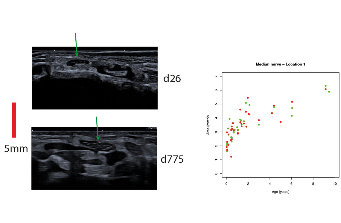 Die Forscherinnen und Forscher des Ostschweizer Kinderspitals St. Gallen haben in einem großen Forschungsvorhaben das Wachstum verschiedener peripherer Nerven beim Säugling und beim Kleinkind untersucht. Die Studie zum Wachstum der Nervenwurzeln C5 und C6 wurde aufgrund ihrer Bedeutung für die Betreuung von Kindern, Säuglingen und Neugeborenen mit dem Anna Mueller Grocholski Preis der Schweizerischen Gesellschaft für Neuropädiatrie ausgezeichnet [1]. Mittels hochfrequenter Ultraschalltechnik konnten die Forscherinnen und Forscher zeigen, dass sich der Durchmesser der zervikalen Nervenwurzeln C5 und C6 in den ersten zwei Lebensjahren mehr als verdoppelt und dabei einer logarithmischen Wachstumskurve folgt – analog zur Zunahme der Nervenleitgeschwindigkeit.