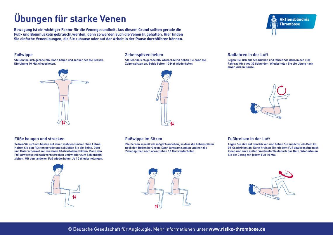 Menschen, die viel im Sitzen oder Stehen arbeiten, haben ein höheres Risiko, an einer Thrombose zu erkranken. Die besondere Schwierigkeit dabei ist, dass den Tag über das Blut gegen die Schwerkraft aus den Beinen zum Herzen zurücktransportiert werden muss. Als natürliche Pumpe dient dafür unter anderem die Fuß- und Beinmuskulatur. Mit jeder Anspannung pressen die Muskeln das Blut gegen die Schwerkraft von unten in Richtung Herz. Dutzende von Venenklappen sorgen wie Rückschlagventile dafür, dass das Blut bei der Entspannung des Muskels nicht wieder nach unten zurückfällt.