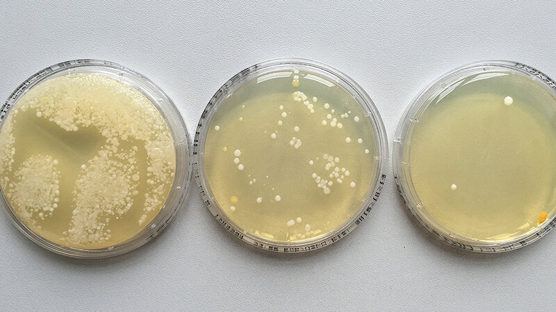 Nach 48 Stunden wurden die Nährmedien (Caso-Agar) aus dem Brutschrank geholt und beurteilt. Meistens handelte es sich um die Normalflora der Haut (Staphylococcus spp., apathogene Corynebakterien, Mikrokokken et cetera).