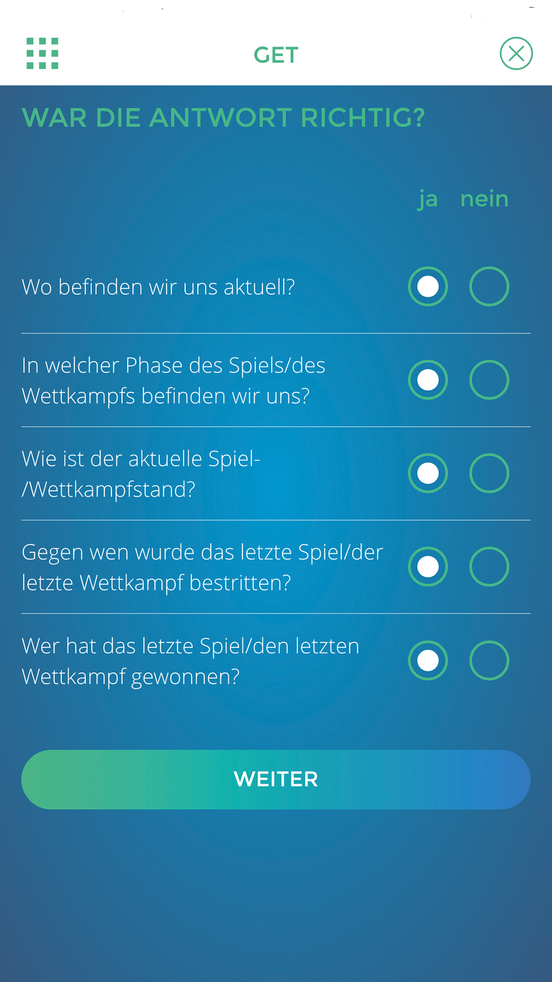 Die Trainerversion der GET-App richtet sich an Trainer und Betreuer im Mannschaftssport. Sie ermöglicht, Baseline-Werte für ein gesamtes Team zu speichern, um im Notfall sofort darauf zurückgreifen und Veränderungen erkennen zu können (Baseline = Ruhewert, der vor der Saison erhoben wird). Innerhalb von wenigen Minuten kann die Möglichkeit einer Gehirnerschütterung mittels Symptomerfassung, Gedächtnistest, Reaktionstest, Testung der Augenfunktion und des Gleichgewichts ermittelt werden. Kostenloser Download in allen App-Stores, Infos: https://schuetzdeinenkopf.de/service/mediathek/get-app