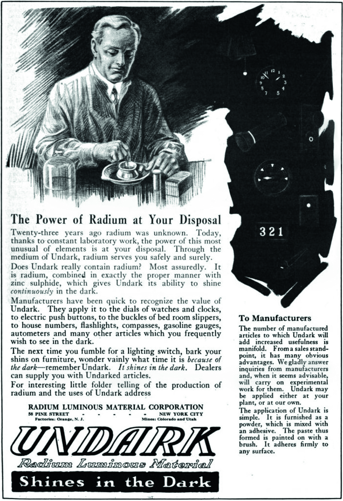 Die für den Ersten Weltkrieg mit Leuchtziffern produzierten Uhren, besonders für Soldaten, wurden ein Kassenschlager. Die „Radium Girls“ arbeiteten in großen hellen Produktionshallen an kleinen Arbeitstischen. Die Kamelhaarpinsel, die die meist sehr jungen Frauen und Mädchen ab zwölf Jahren in den Fabriken benutzten, veränderten nach wenigen Strichen ihre Form. Den Arbeiterinnen wurde empfohlen, die Pinsel mit den Lippen und der Zunge wieder zu spitzen. Aus Spaß bepinselten sie ihre Zähne und Fingernägel mit Undark und zeigten einander, wie alles Bemalte im Dunkeln, zur Überraschung ihrer Mitmenschen, bei Nacht leuchtete.