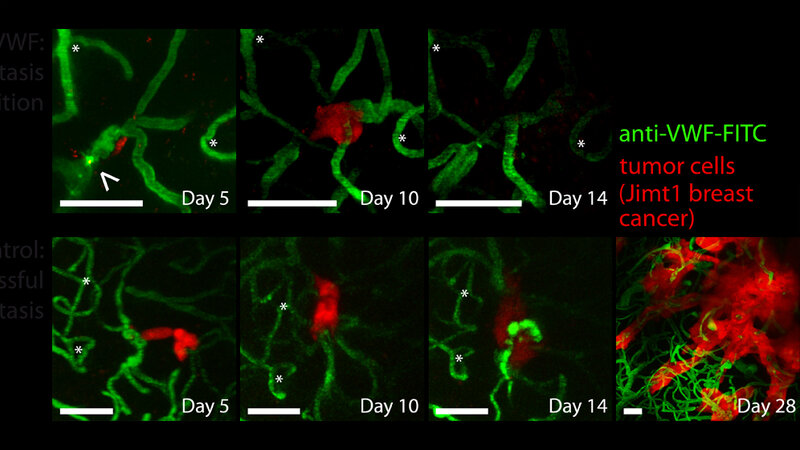 Die Mäuse erhielten Melanom- oder Brustkrebszellen in die Blutbahn gespritzt. Einzelne der zirkulierenden Tumorzellen setzten sich daraufhin in den feinen Blutkapillaren des Gehirns fest. Nur, wenn es diesen Zellen nun gelingt, durch die Gefäßwand ins Hirngewebe vorzudringen, können sie zur Hirnmetastase auswachsen. Winker und Kollegen beobachteten, dass sich um die festgesetzten Tumorzellen häufig Thromben bildeten. Krebszellen, um die sich kein solches Gerinnsel bildete, schafften es nicht, die Kapillarwand zu durchdringen. „Offenbar hilft der Thrombus den Zellen dabei, sich lange in der Kapillare festzuhalten, um die Passage durch die Gefäßwand vorbereiten zu können“, erklärt Winkler.