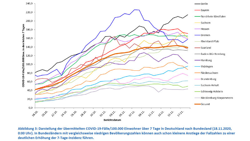 Dass in den Krankenhäusern nicht nur Menschen landen, die Vorerkrankungen haben, betonte Wieler bei der PK. Eine Auswertung zur ersten Welle habe gezeigt, dass etwa ein Drittel der Patienten ins Krankenhaus eingeliefert wurden, die keinerlei Grunderkrankungen hatten. Wieler bleibt trotzdem optimistisch, dass in der kommenden Woche die Infektionszahlen sinken werden. Es bleibt somit abzuwarten, ob dieser Optimismus gerechtfertigt ist. Schaut man sich die Inzidenzraten der Schülergruppe (10-19-Jährige) an (178) und der jüngeren Erwachsenen (20-29-Jährige) mit 219 dürfte Skepsis angebracht sein und ein geselliges Weihnachten eher in weite Ferne rücken. Ohne weitere Maßnahmen dürfte es ohnehin schwerfallen, die Infektionszahlen wieder auf ein Niveau zu bringen, bei dem die Nachverfolgungen durch die Gesundheitsämter wieder gewährleistet sind.