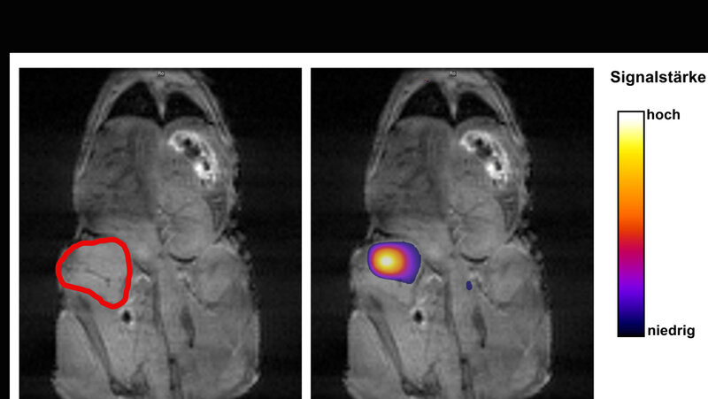 Das signalverstärkte Pyruvat verabreichte das Team um Glöggler Mäusen, die an bösartigen Tumoren litten. Anschließend verfolgten die Forscherinnen und Forscher in Echtzeit, wie Pyruvat in Milchsäure umgewandelt wurde. „Da diese Reaktion charakteristisch für Krebszellen ist, konnten wir in den Nagern die Tumore anhand ihrer Stoffwechselaktivität klar von gesundem Körpergewebe abgrenzen“, sagt der Chemiker.