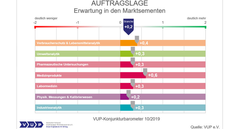 Die Erwartungen innerhalb dieser Marktsegmente sind dabei unterschiedlich. Während Medizinprodukte (0,6) und Verbraucherschutz (0,4) noch deutlich über dem Branchendurchschnitt liegen, gruppieren sich die übrigen Marktbereiche um diesen. Bei der Einschätzung der Auftragslage liegt die Labormedizin mit +0,3 nur leicht über dem Durchschnitt der Gesamtbranche (+0,2).