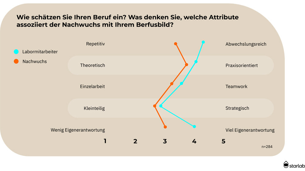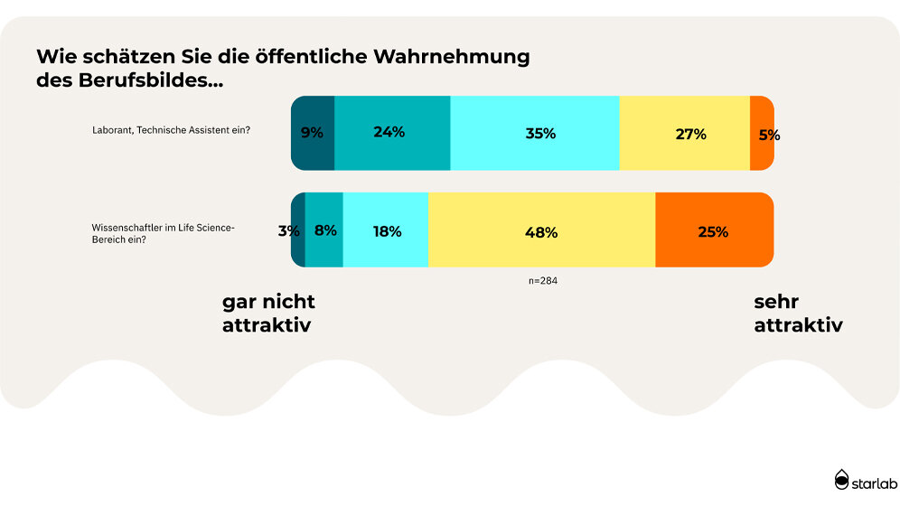 Bereits im Januar dieses Jahres wurden in einem Stimmungsbarometer neben Versorgungsengpässen insbesondere der Personalmangel von über 30 Prozent der Befragten als eines der drängendsten Probleme der Laborbranche genannt. Die von Starlab initiierte Umfrage zeigte mögliche Gründe dafür auf: Während Wissenschaftler im Life-Science-Bereich zu fast 75 Prozent mit einer attraktiven (48 Prozent) oder sogar sehr attraktiven (25 Prozent) öffentlichen Wahrnehmung ihres Berufsstandes rechnen, sieht es bei Laboranten und Technischen Assistenten sehr viel schlechter aus: Hier glauben nur rund 32 Prozent der Befragten, dass ihr Beruf in der Öffentlichkeit als attraktiv oder sogar sehr attraktiv wahrgenommen wird. Ein weiteres Drittel (31 Prozent) meint, dass ihr Beruf für wenig bis gar nicht attraktiv gehalten wird. Im Mittelwert tauchen Laboranten und Technische Assistenten in der öffentlichen Wahrnehmung deshalb nach den Lehrern erst an vierter Stelle auf, während sich Life Science-Wissenschaftler gleich an zweiter Position hinter den Ärzten wiederfinden. Das hat möglicherweise auch mit einem verzerrten Berufsbild des Nachwuchses zu tun. Denn ausgebildete Labormitarbeiter halten ihren Job grundsätzlich für abwechslungsreicher, praxisorientierter und eigenverantwortlicher, als sie das für die Erwartungshaltung des potenziellen Nachwuchses postulieren.