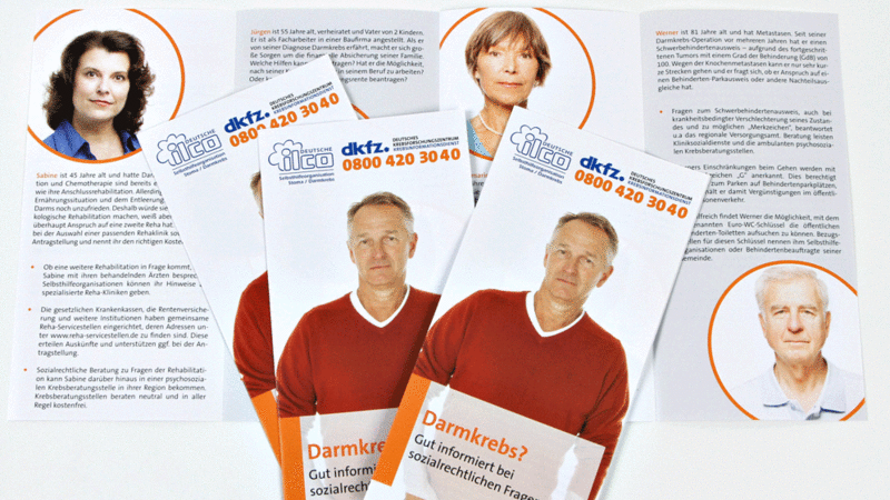 Vier Betroffene zwischen 45 und 81 Jahren schildern im Flyer „Darmkrebs? Gut informiert bei sozialrechtlichen Fragen“ ihre ganz persönlichen Ängste, Sorgen und Fragen rund um ihr Leben mit Darmkrebs. Kann ich eine onkologische Rehabilitation beantragen? Wie komme ich im Berufsalltag mit meiner Erkrankung klar? Wer übernimmt langfristig die Kosten und welche Hilfsangebote stehen mir zu? Der Flyer liefert Orientierung und erste Antworten auf diese und weitere Fragen aus dem Alltag Betroffener. Außerdem nennt er wichtige Ansprechpartner, Anlaufstellen und Adressen und gibt praktische Tipps.