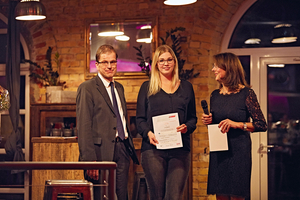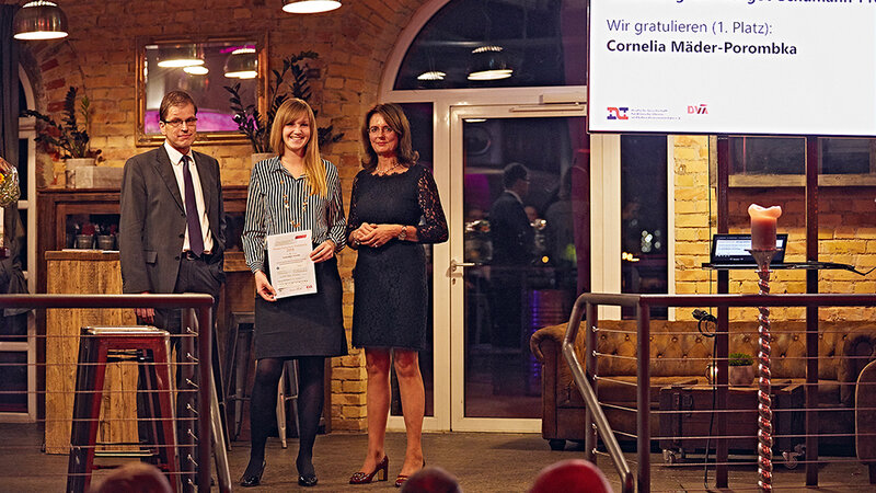 Cornelia Mäder-Porombka (hier mit Dr. Markus Neumann und Christiane Maschek) gewinnt den ersten Platz (1.000 Euro). Für alle: © DGKL/Ben van Skyhawk