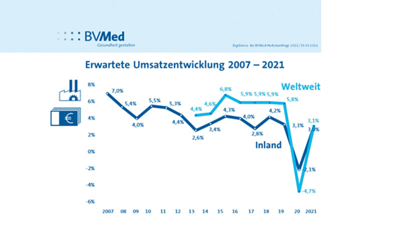 Die Medizintechnik-Branche zeigt sich von den starken Umsatzeinbrüchen im Coronakrisenjahr 2020 leicht erholt. Nach einem Umsatzrückgang von 2,1 Prozent im Vorjahr erwartet die Branche in diesem Jahr in Deutschland ein Umsatzwachstum von 3,0 Prozent, weltweit von 3,1 Prozent.