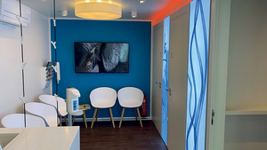 Schon beim Betreten wird der Besucher positiv überrascht: Nicht kalter Stahl, sondern ein ansprechendes Interieur hinterlässt bei den Untersuchungspatienten einen positiven Eindruck – mit liebevollen Details und warmen Farben statt kaltem Weiß am Empfang. Ein Warteraum, drei Kabinen und ein WC ergänzen den Eingangsbereich. Dahinter befindet sich das Büro des Radiologen Dr. Viet Truc Tran, der neben den Fußballern auch Privatpatienten und Selbstzahler im Raum Mönchengladbach behandelt.