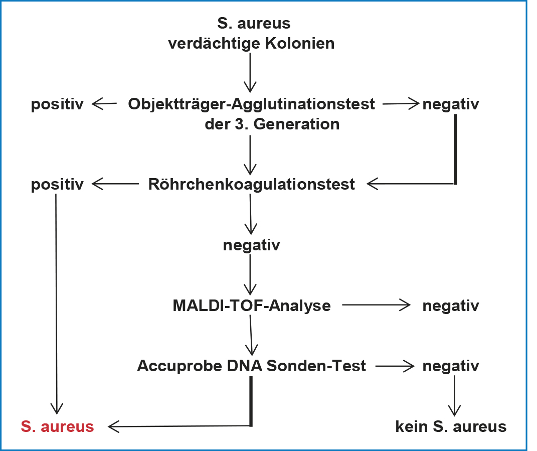Bei zweifelhaften Ergebnissen oder bei weiter bestehendem Verdacht auf das Vorliegen von S. aureus kann u. a. eine Identifi- zierung mittels MALDI-TOF zum Ergebnis führen.