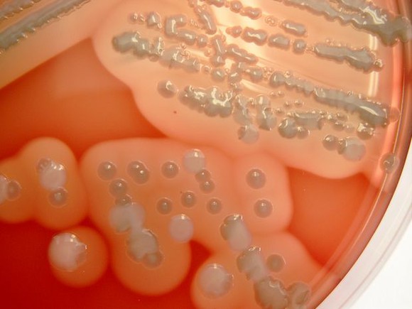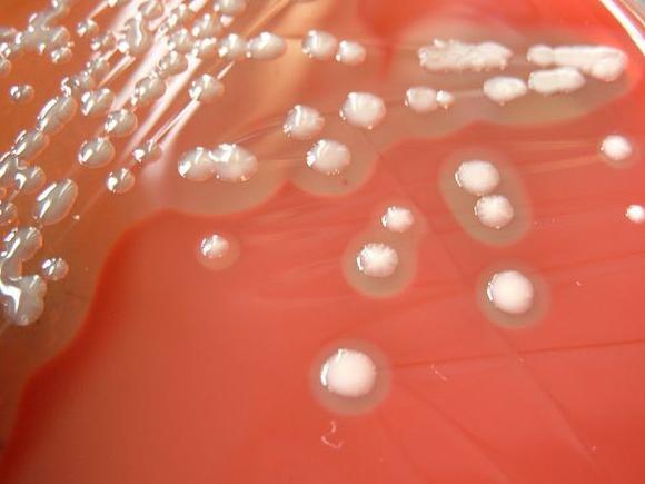 Abb. 3a: Nicht pigmentierte mucoide Kolonien von P. aeruginosa auf Columbia-Blutagar