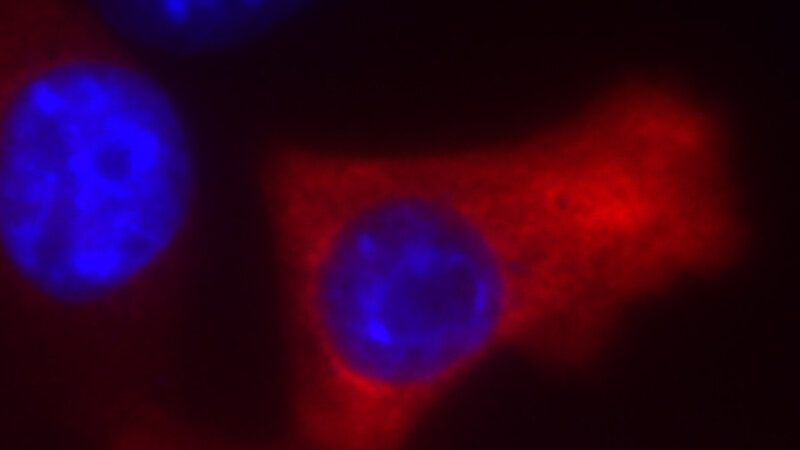 Das Bild zeigt eine Immunfluoreszenz-Aufnahme von TSC22D4 (rot) exprimierenden Zellen. Helmholtz Zentrum München