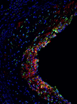 *Die Abbildung zeigt, wie resolutions-induzierende Lipidmediatoren heilende Makrophagen „anschalten“. Gezeigt sind Makrophagen (CD68 in rot, CD206 in grün) in der atherosklerotischen Läsion nach Verabreichung von Resolvin D2 und Maresin 1. (Abbildung: O. Söhnlein, LMU)