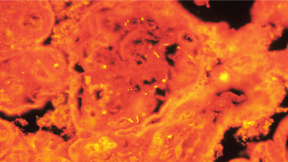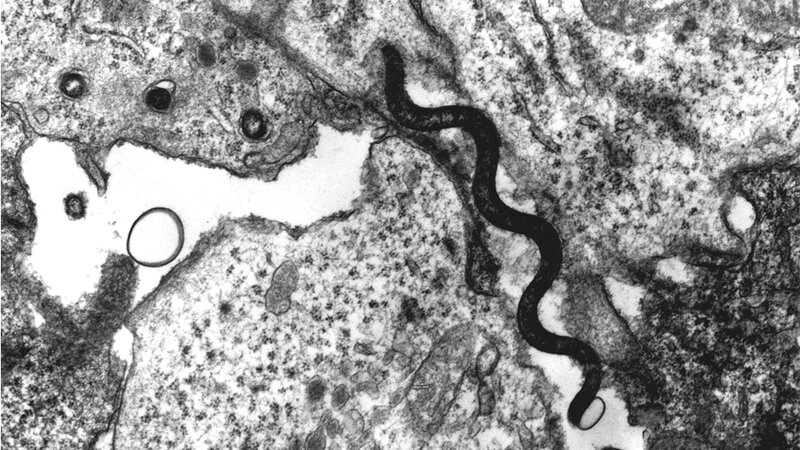 Immunfluoreszenzaufnahme Treponema in menschlichem Gewebe Quelle: Steven J. Norris, UTHealth