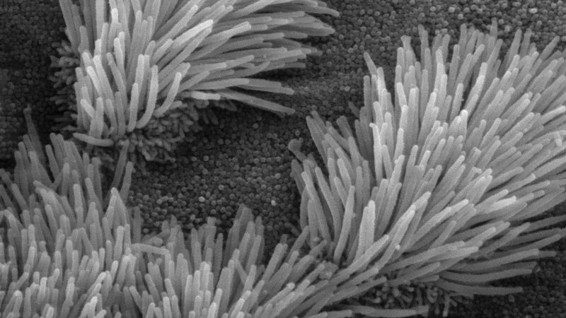 Rasterelektronenmikroskopische Aufnahme von Zilien des Lungenepithels © Charles Daghlian, gemeinfrei