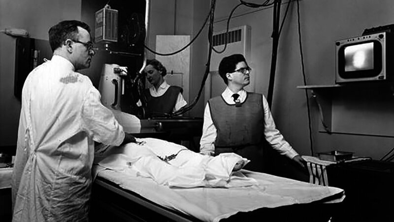 Mason Sones (links) führt eine frühe Koronarangiographie in der Cleveland Clinic in Ohio durch. © Special Collections, Cleveland State University Library