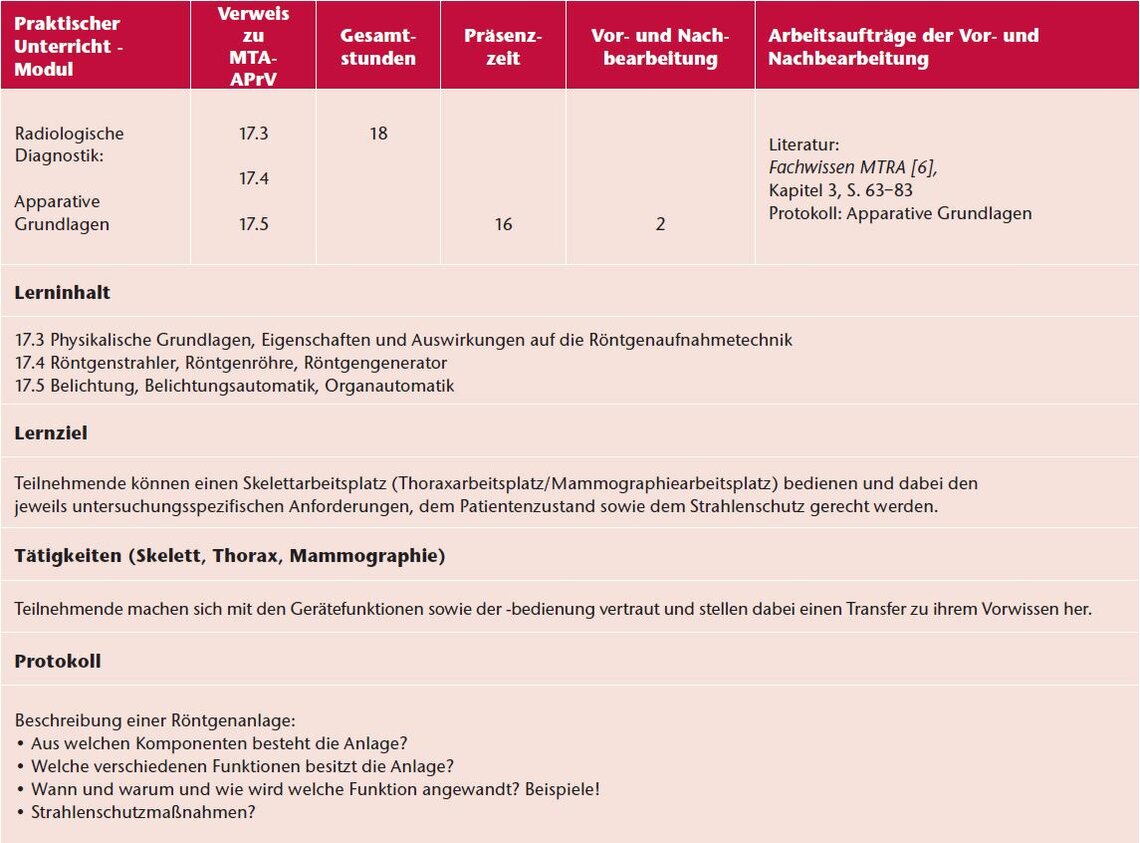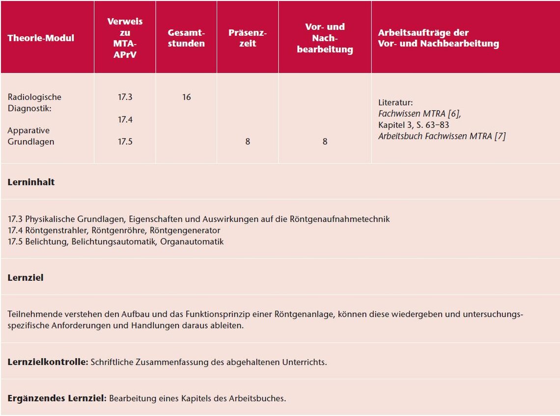 Die theoretischen Module weisen einen Umfang von ein- bis dreimal acht Stunden auf und werden an Samstagen abgehalten. Zusätzlich müssen die Teilnehmerinnen und Teilnehmer eine Vor- und Nachbearbeitungszeit in etwa gleich hohem Umfang investieren, der vor allem dazu dient, die sprachliche Kompetenz auf fachlichem Gebiet zu verbessern und das Wissen zu vertiefen (Tabelle 1). Für diese Phasen ist dabei das Lehrbuch „Fachwissen MTRA“ [6] sowie das „Arbeitsbuch Fachwissen MTRA“ [7] vorgesehen, da sie das gesamte Spektrum der Lerninhalte für den MTRA-Beruf abdecken.
