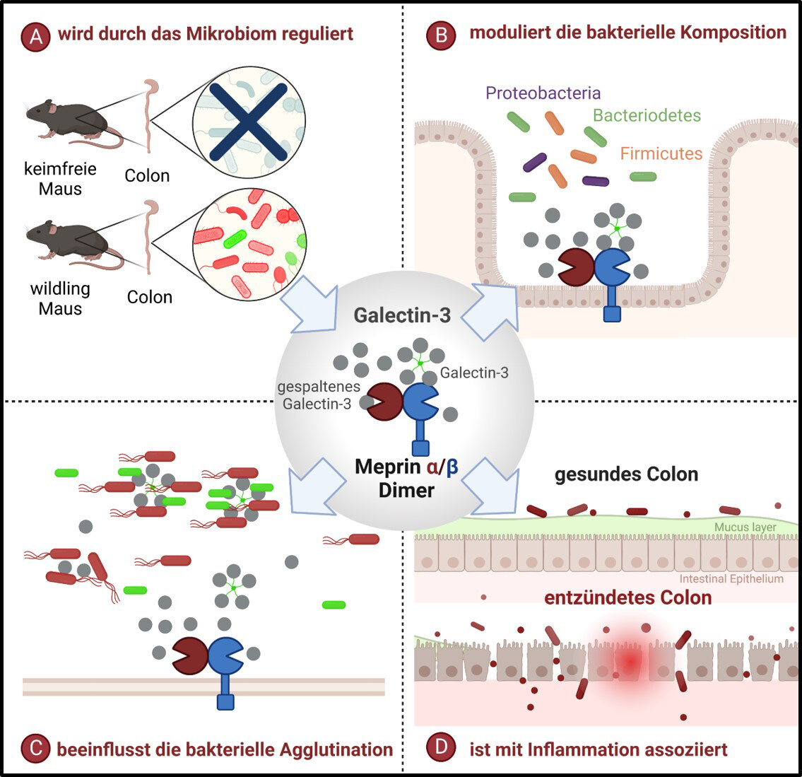 Im Zentrum der Forschung standen die proteinspaltenden Enzyme Meprin α und Meprin β, die im gesunden Darm produziert werden und bei chronisch-entzündlichen Darmerkrankungen (CED) deutlich vermindert sind. „Wir wollten einerseits die Funktion der Meprine im Dünn- und Dickdarm aufklären und andererseits verstehen, wie die Zusammensetzung der Bakterien im Darm grundlegend reguliert wird“, sagt Bülck. Die Proteasen kommen im gesamten Darm vor, sind aber keine typischen Verdauungsenzyme. „Bereits in früheren Studien konnten wir zeigen, dass diese Enzyme für die ständige Ablösung und Erneuerung der Darmepithel-schützenden Schleimschicht verantwortlich sind“, so Becker-Pauly. Um die weiteren Funktionen der Meprine aufzuklären, die im Dickdarm als Meprin α/β-Komplex vorkommen, haben die Forscherinnen und Forscher zunächst mittels eines Massenspektrometrie-Verfahrens nach Substraten gesucht, die von diesem Enzymkomplex umgesetzt werden. Becker-Pauly: „Wir haben Galektin-3 als wichtiges Substrat im Dickdarm identifiziert.“