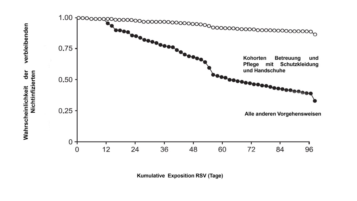 Zu den wichtigsten Empfehlungen in der Infektionsprävention des RS-Virus gehört das Tragen einer persönlichen Schutzkleidung bestend aus: Kittel, Handschuhe, Mund-Nasenschutz mit zusätzlichen Infektionsschutz der Konjunktiven (Augenschutzbrille). Ein Vergleich von 4 verschiedenen Vorsichtsmaßnahmen, einschließlich keiner Vorsichtsmaßnahmen, zeigten Madge und Mitarbeiter auf einer pädiatrischen Intensivstation, dass das Flaschenstillen mit persönlicher Schutzkleidung und das Tragen von Einmalhandschuhen, die nutzbringenden Maßnahmen waren, nosokomiale RSV-Infektionen vorzubeugen (Abbildung 1). Isolierung, Überwachung, Vermeidung von Kreuzkontaminationen und Schulung der Mitarbeiter sind in der Infektionsprävention des RS-Virus daher ausschlaggebend. Nach dem Ausziehen der Schutzkleidung ist stets eine Händedesinfektion durchzuführen; die oft unterlassen wird. Ein Stethoskop, um den Hals getragen, stellt einen besonderen Risikofaktor für das Verbreiten von pathogenen Mikroorganismen dar: Merke: RS-Viren können 20 Minuten auf Händen, 45 Minuten auf Papierhandtüchern und Baumwollkitteln und bis zu mehreren Stunden auf Stethoskopen, Einmalhandschuhen und Kunststoffoberflächen überleben und können somit als Vehikel für nosokomiale RSV-Ausbrüche fungieren!